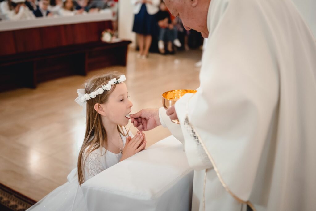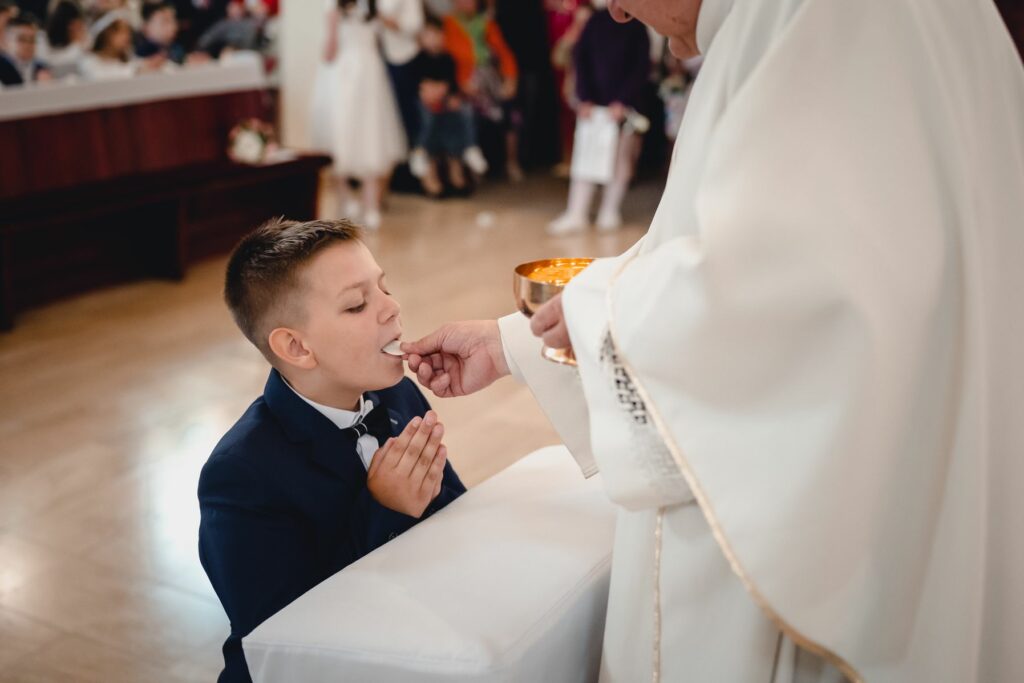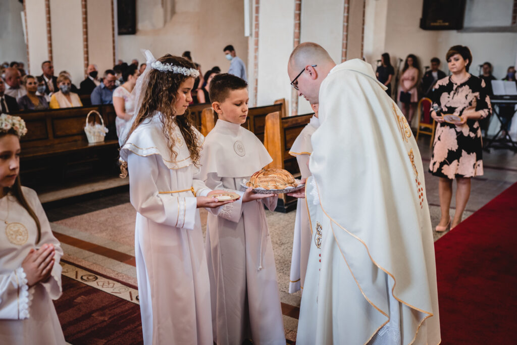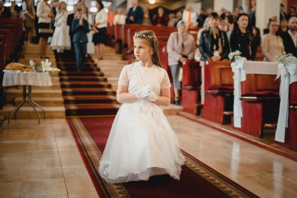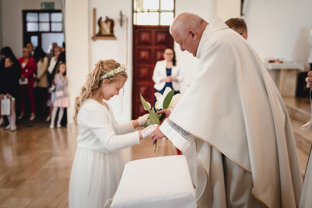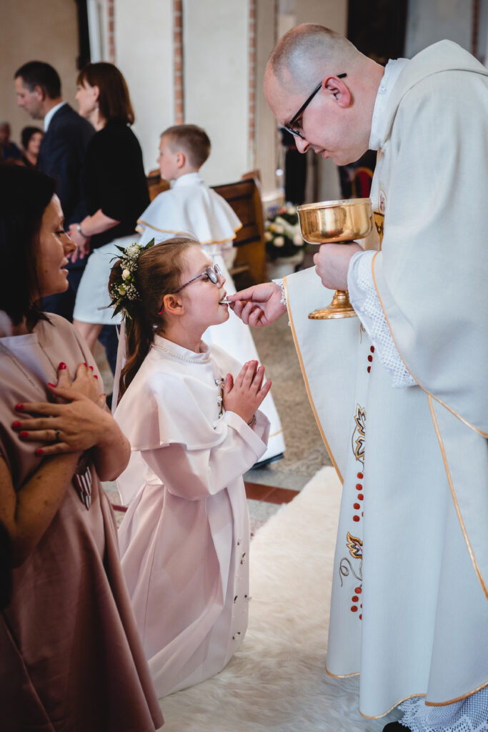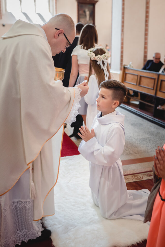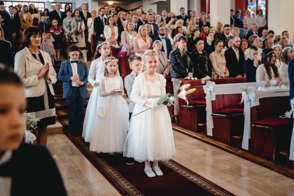Reportaż fotograficzny w tym ważnym dniu zaczynam od zdjęć dzieci przed kościołem w momencie kiedy się szykują i ustawiają. Wykonuję wtedy portret każdemu dziecku oraz zdjęcia reportażowe całego otoczenia. Uwiecznię Wasze emocje oraz zamieszanie, które będzie temu towarzyszyć. ( naturalne, nie ustawiane zdjęcia najczęściej są najciekawsze). Potem zgodnie z przebiegiem mszy będę uwieczniać wszystko to co się będzie na niej działo. Czytania, niesienie darów, podziękowania i najważniejsze przyjęcie pierwszej komunii świętej przez Wasze dziecko. Po zakończeniu mszy wykonamy zdjęcie grupowe wszystkich dzieci oraz zdjęcia rodzinne (na dworze lub w kościele w zależności od pogody).