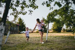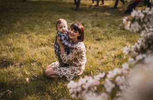 Przepiękne zdjęcia w sadzie owocowym wychodzą nie tylko kiedy jest w pełni rozkwitnięty, ale i w środku lata. Jaka jest to ogromna przyjemność kiedy można na boso chodzić po ciepłej trawie w cieniu liści bawiąc się z dzieckiem.