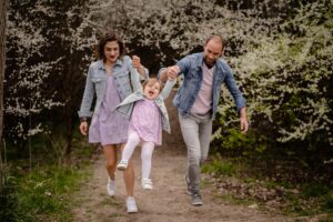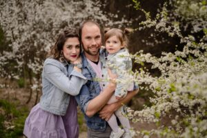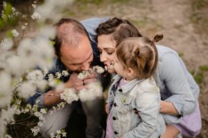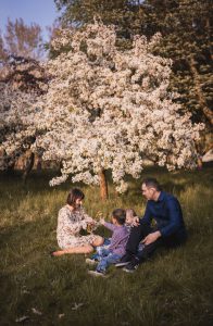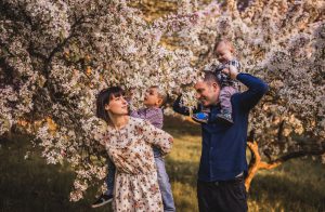 Rodzinna sesja plenerowa wśród kwitnących drzew w parku w Koszalinie