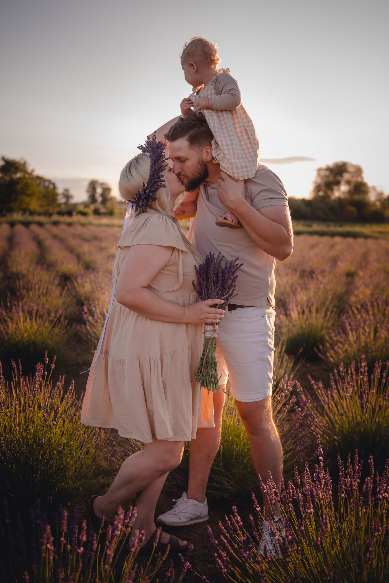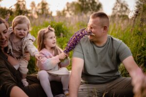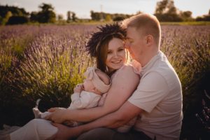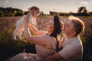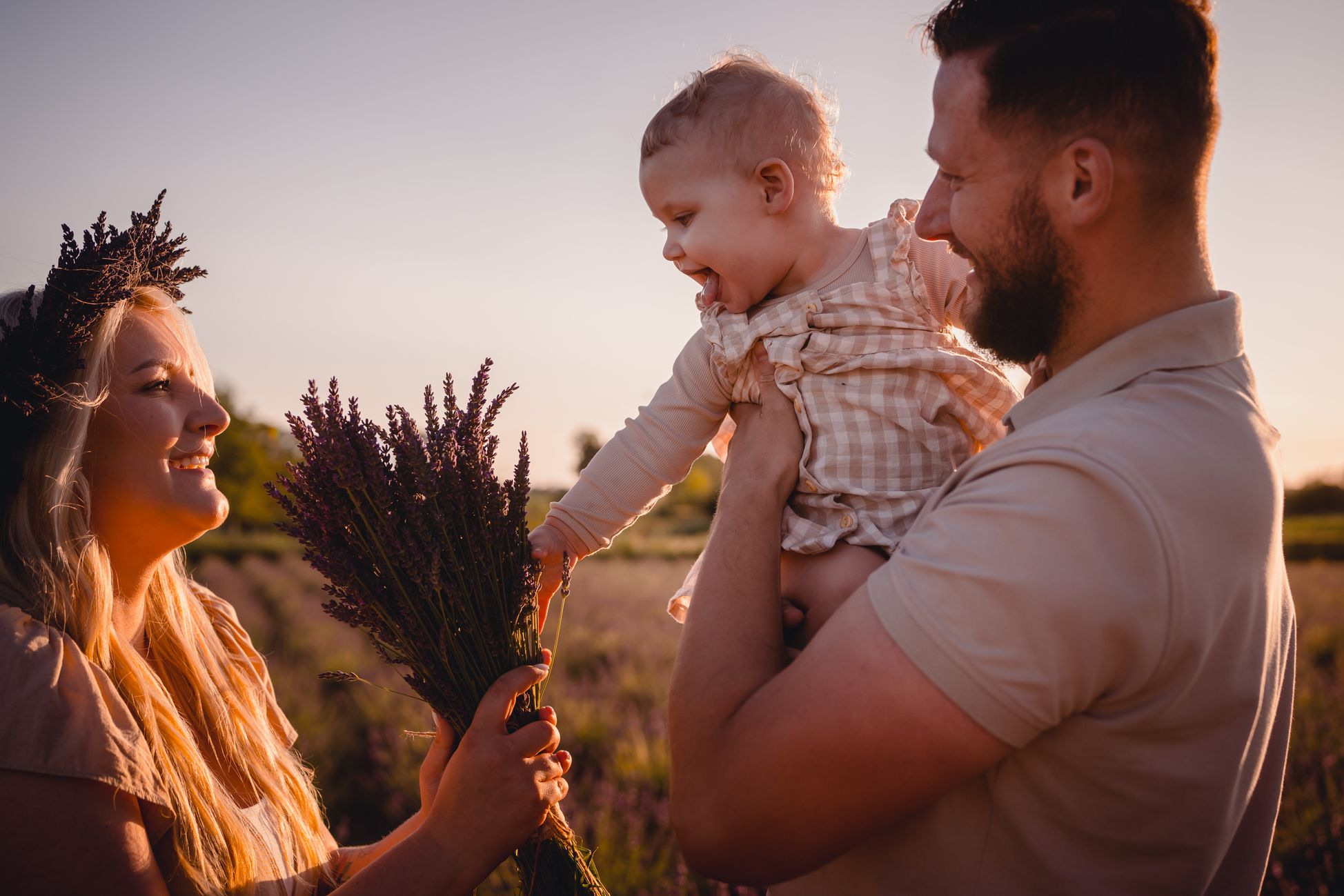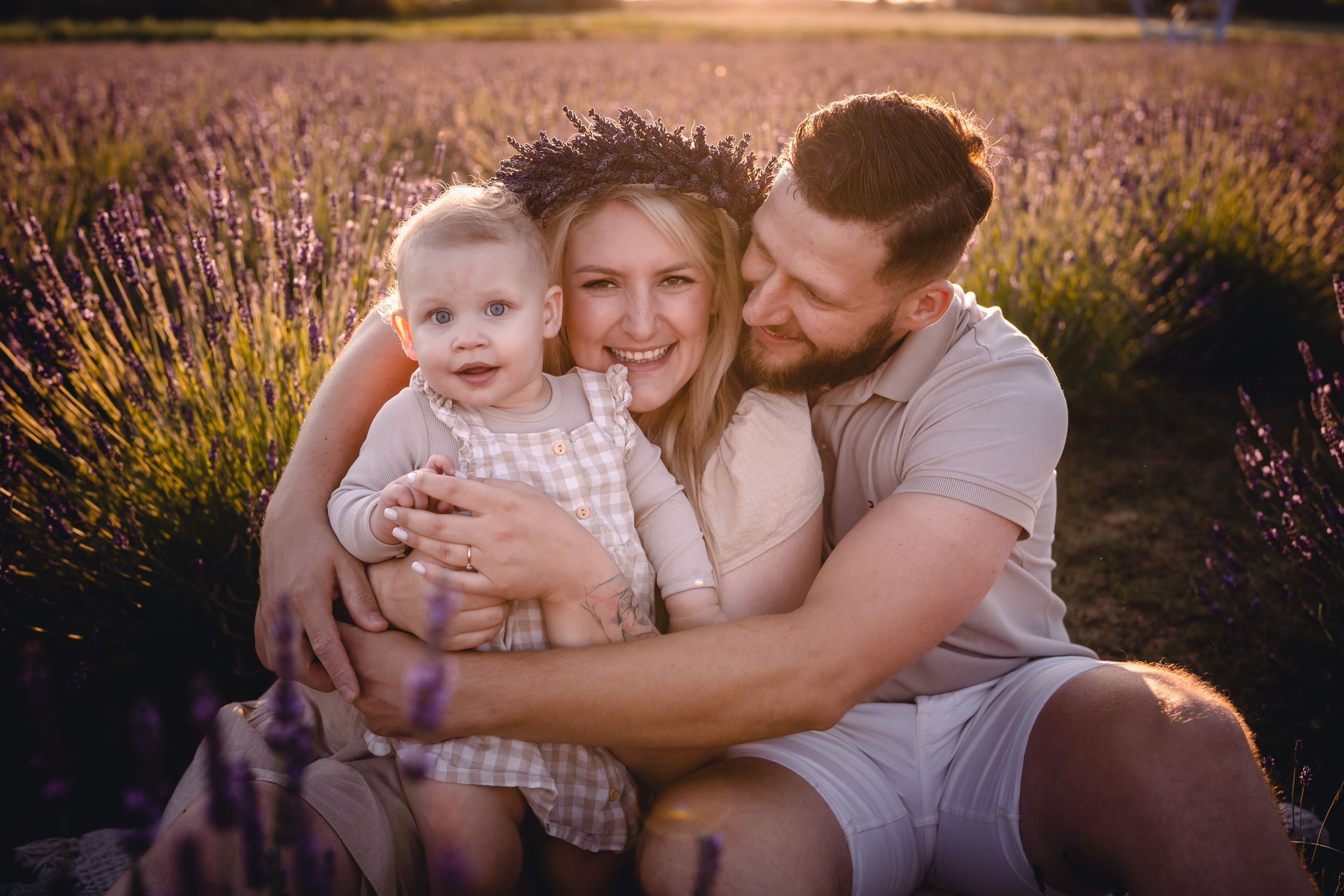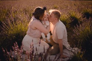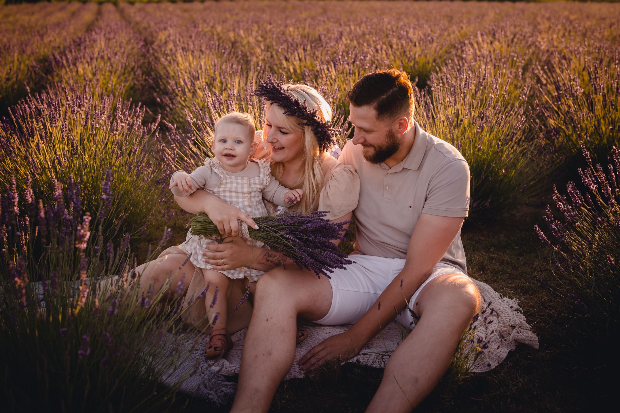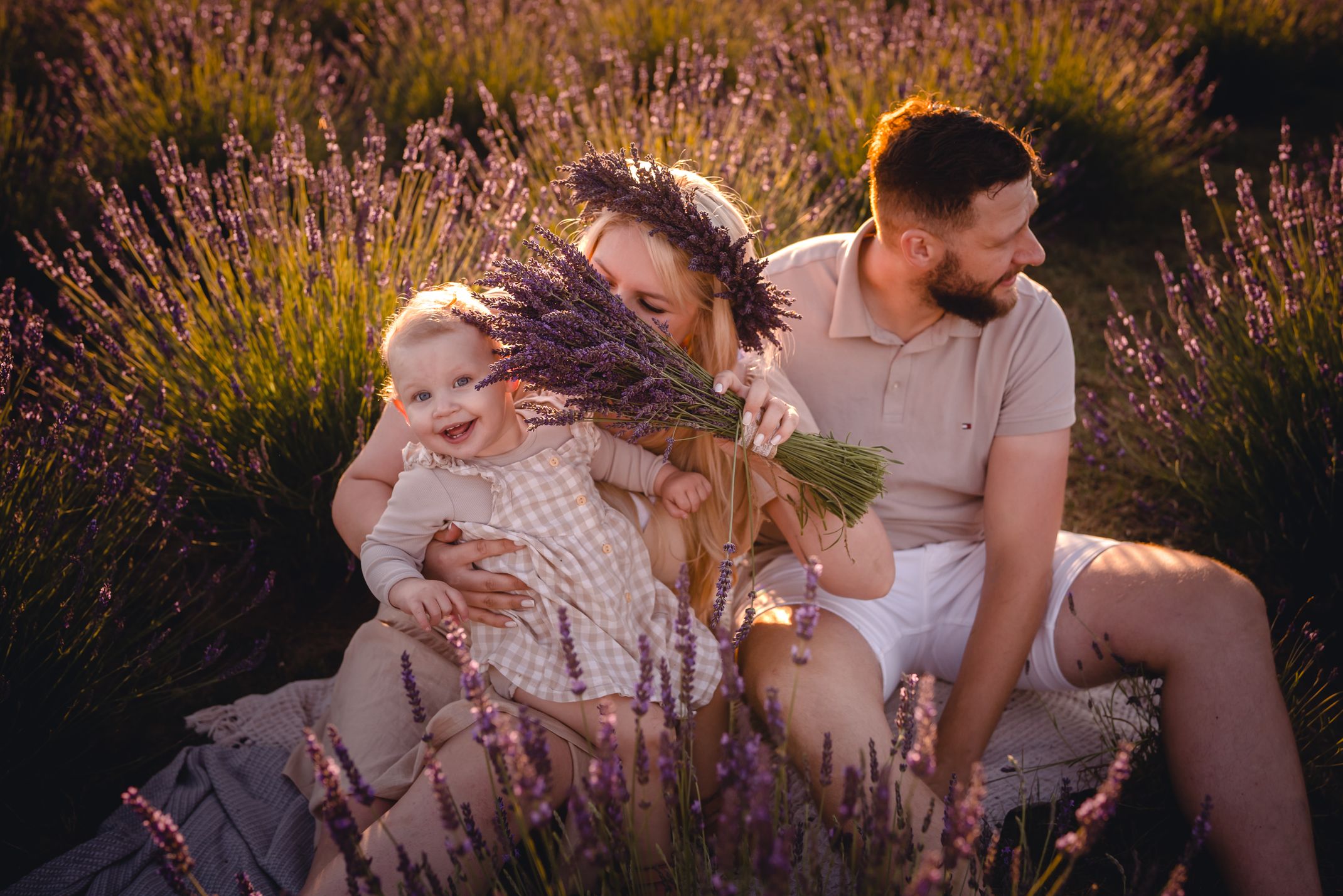 Plenerowa sesja rodzinna w lawendzie o zachodzie słońca