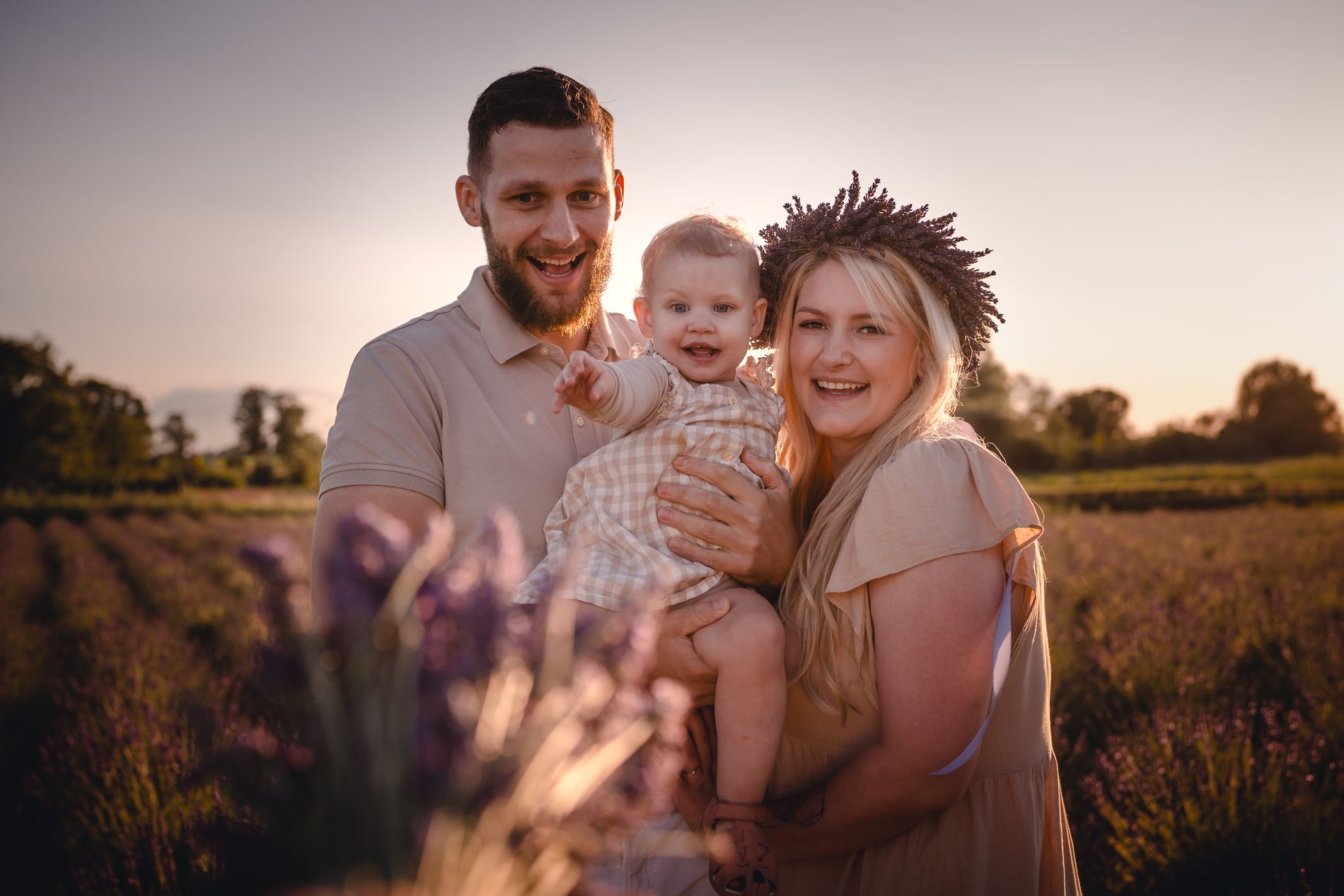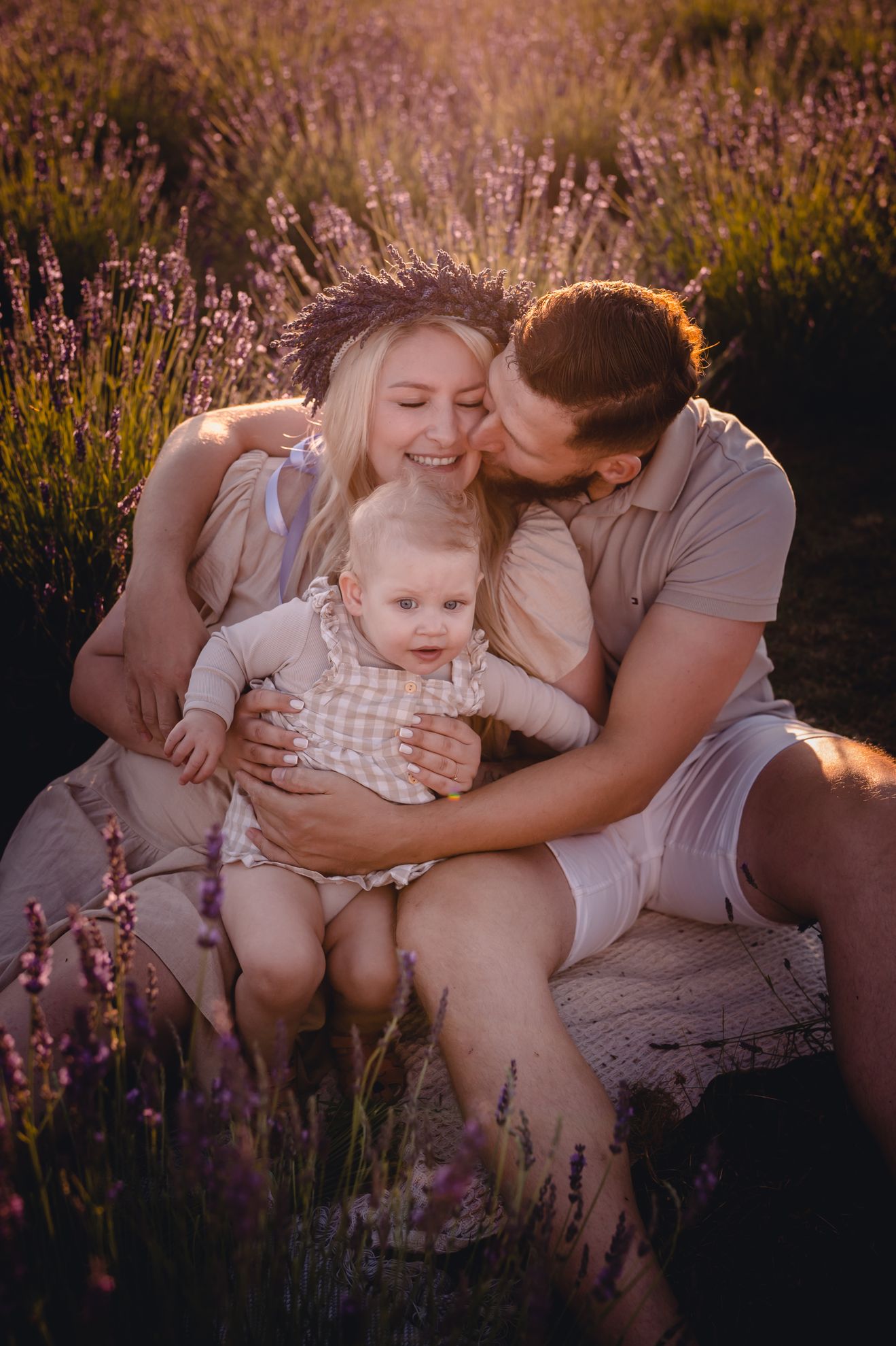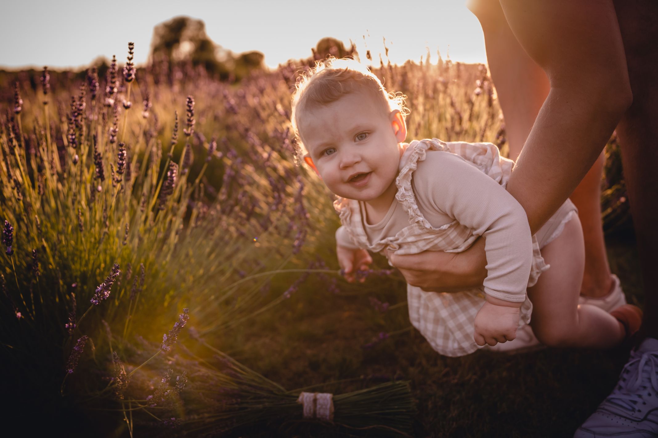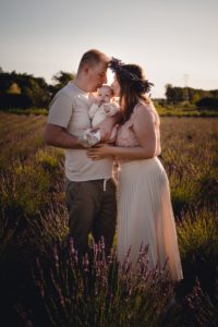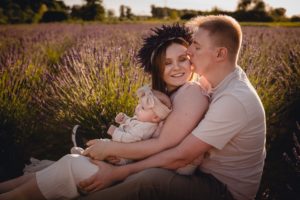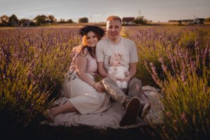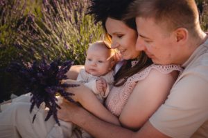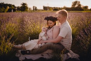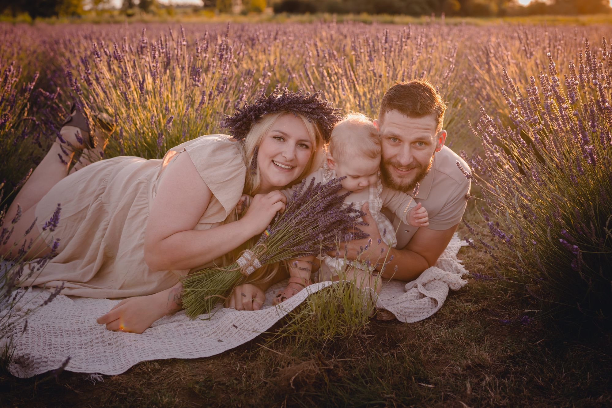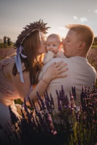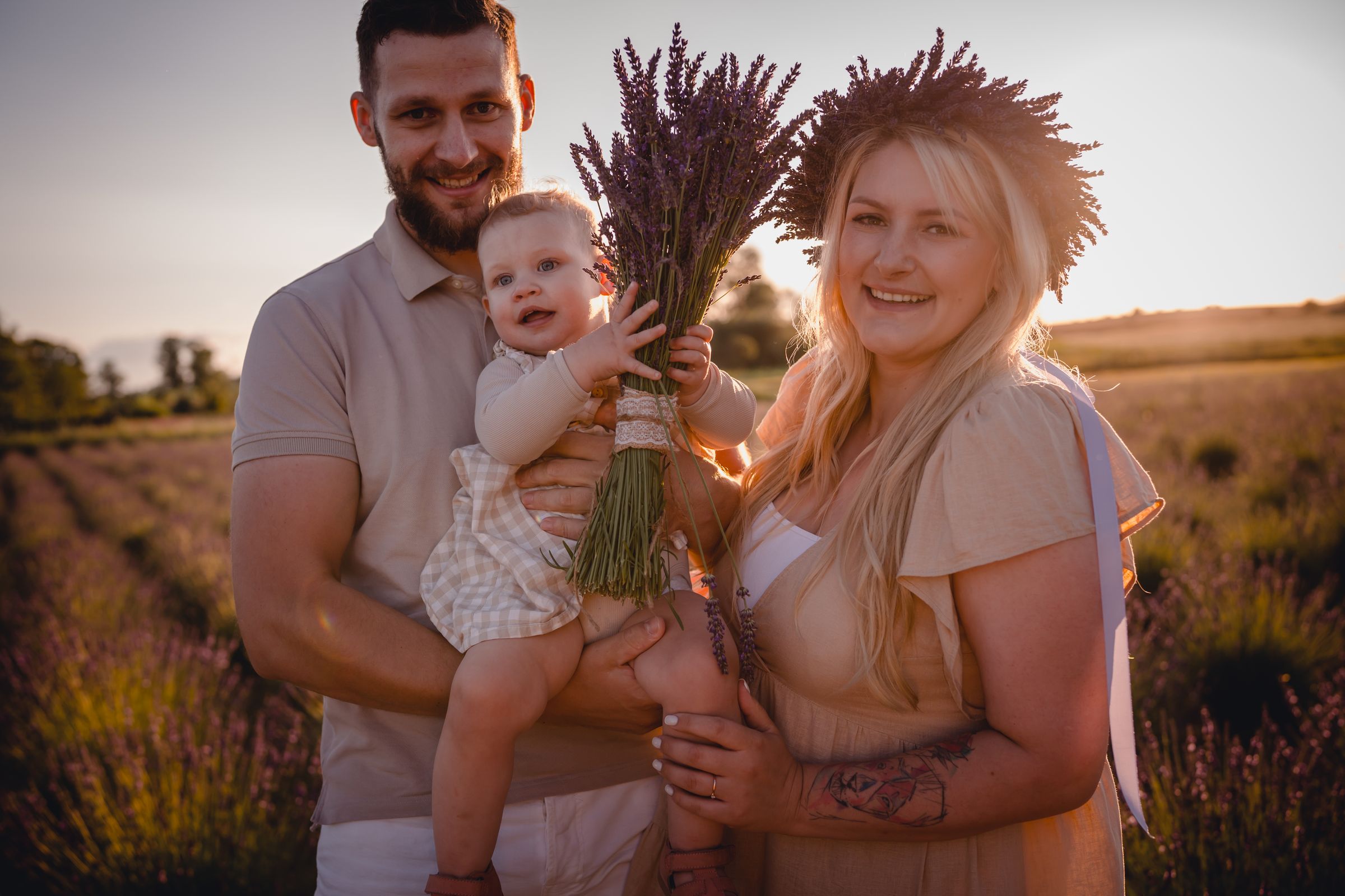 Plenerowa sesja rodzinna w lawendzie o zachodzie słońca