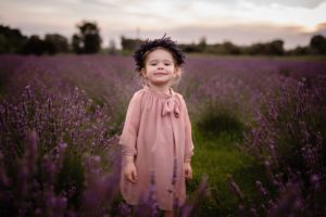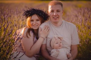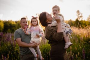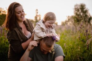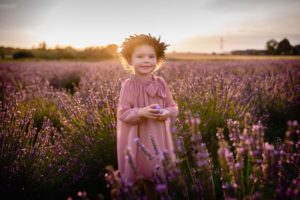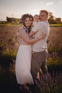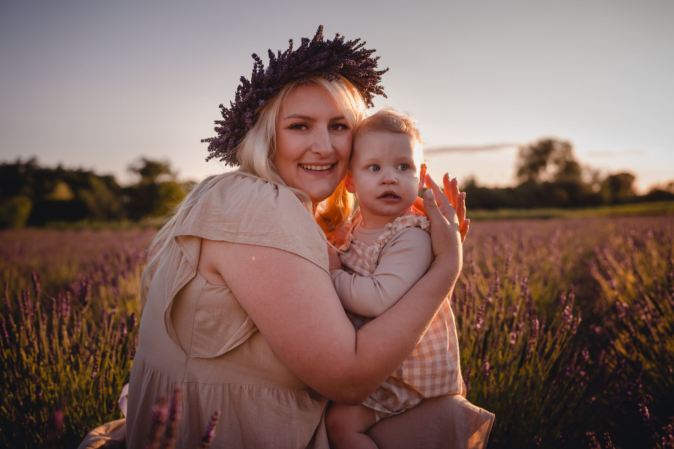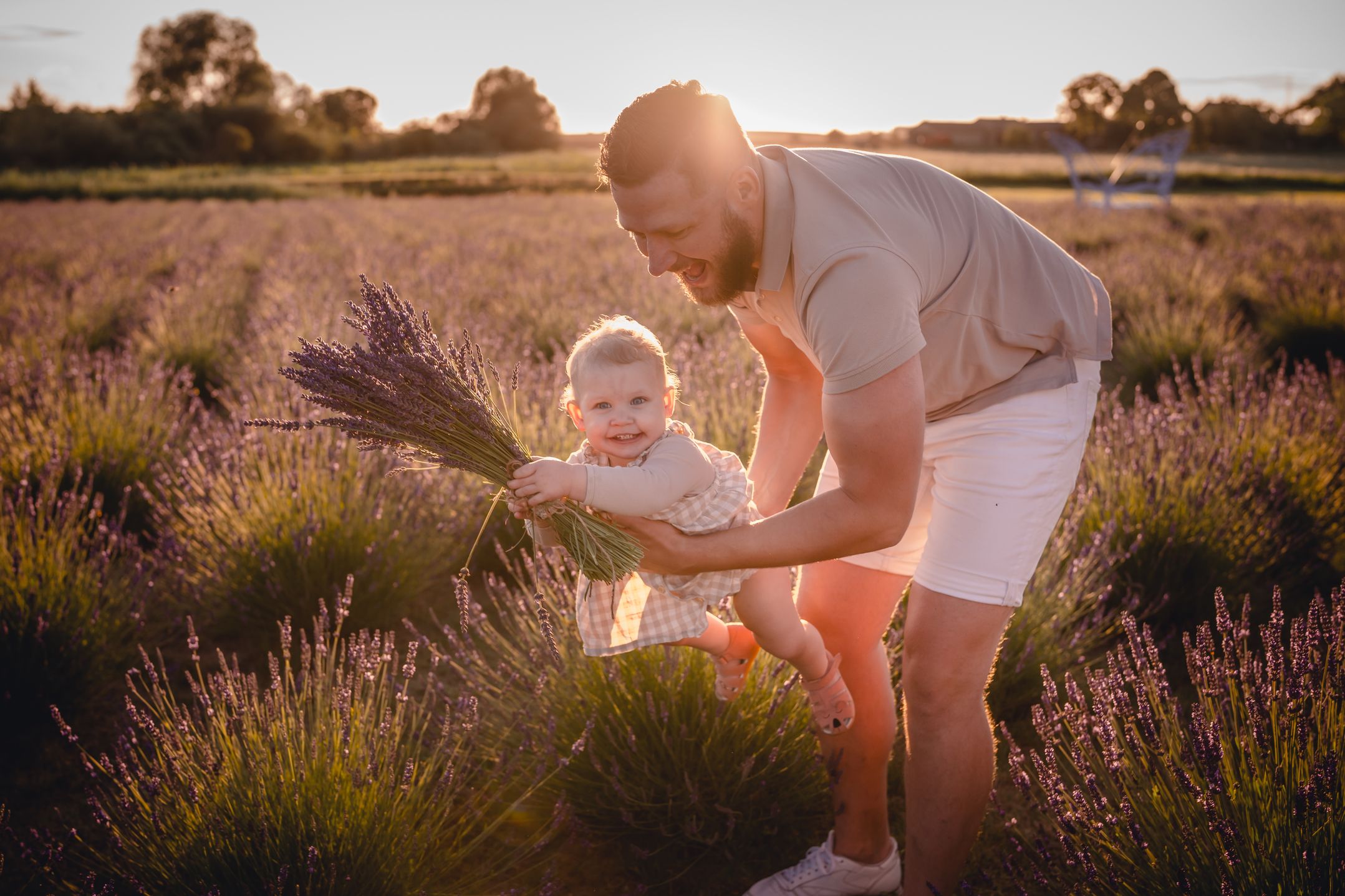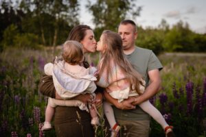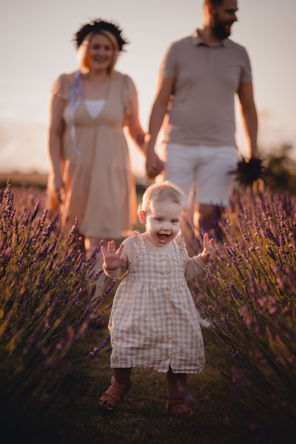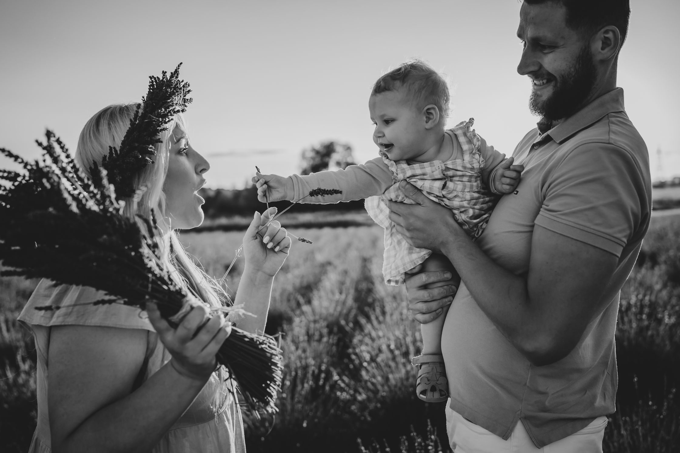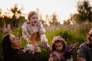 Plenerowa sesja rodzinna w lawendzie o zachodzie słońca