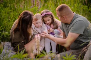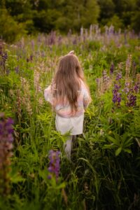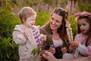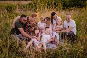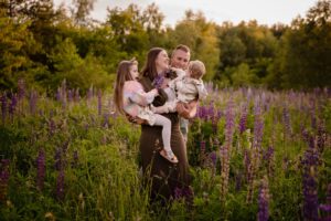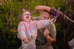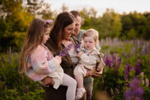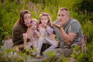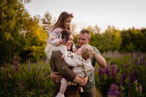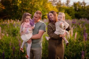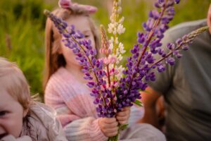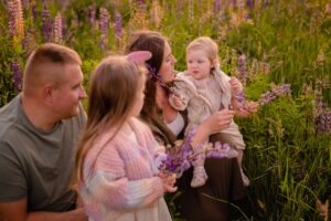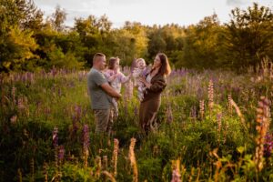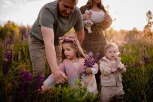 Sesja rodzinna w plenerze na łące pełnej łubinu