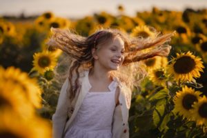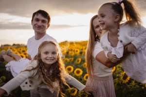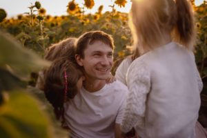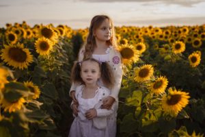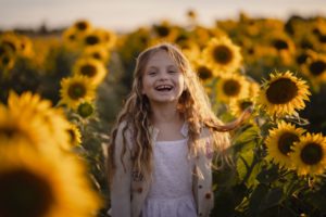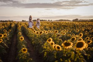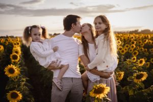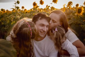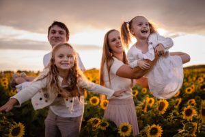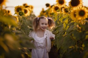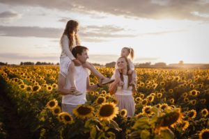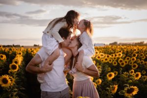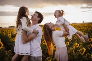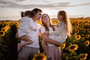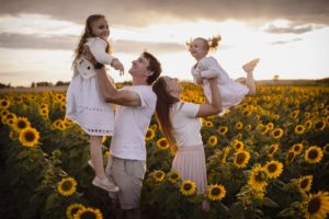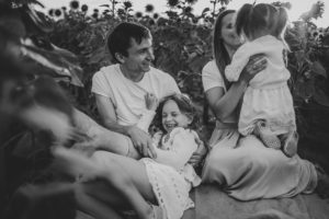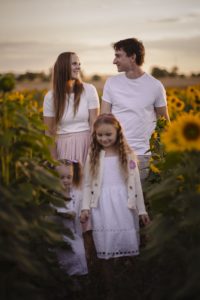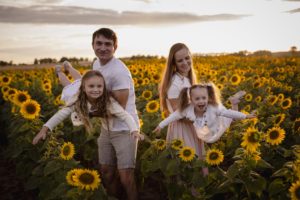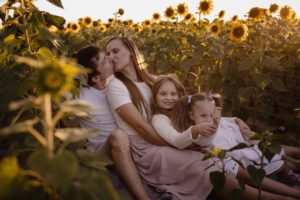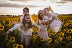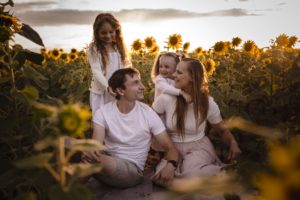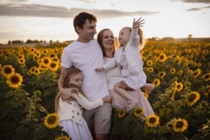 Sesja rodzinna z dziećmi wśród polnych kwiatów oraz na polu słoneczników- Koszalin